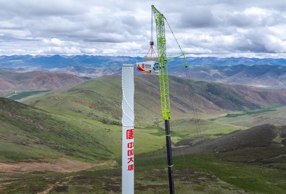 7月10日,在藏東南高原,隨著現(xiàn)場指揮員一聲令下,1800噸汽車吊將重達117噸的風(fēng)機葉輪組件緩緩吊至110米高空與機艙精準(zhǔn)對接,標(biāo)志著世界在建最高海拔風(fēng)電場——大唐西藏能源開發(fā)有限公司八宿100兆瓦保障性并網(wǎng)風(fēng)電項目首臺風(fēng)機吊裝作業(yè)順利完成,實現(xiàn)了中國大唐在藏風(fēng)電工程建設(shè)從無到有的跨越式發(fā)展,也為雪域高原增添了又一綠色能源新地標(biāo)。